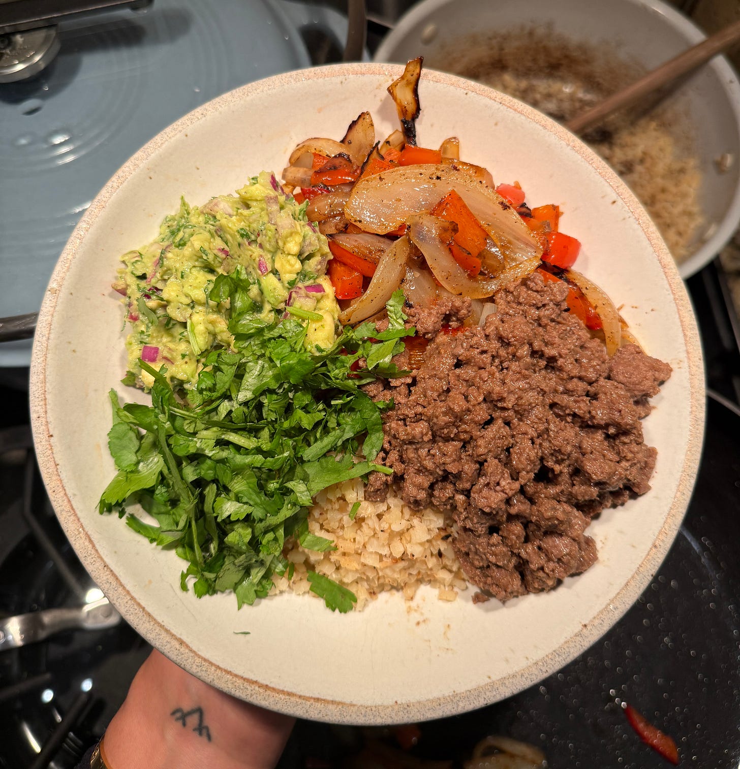 Layer bowls with cauliflower rice as the base, then meat, peppers and onions, and guacamole. Squeeze extra lime if desired. Enjoy!